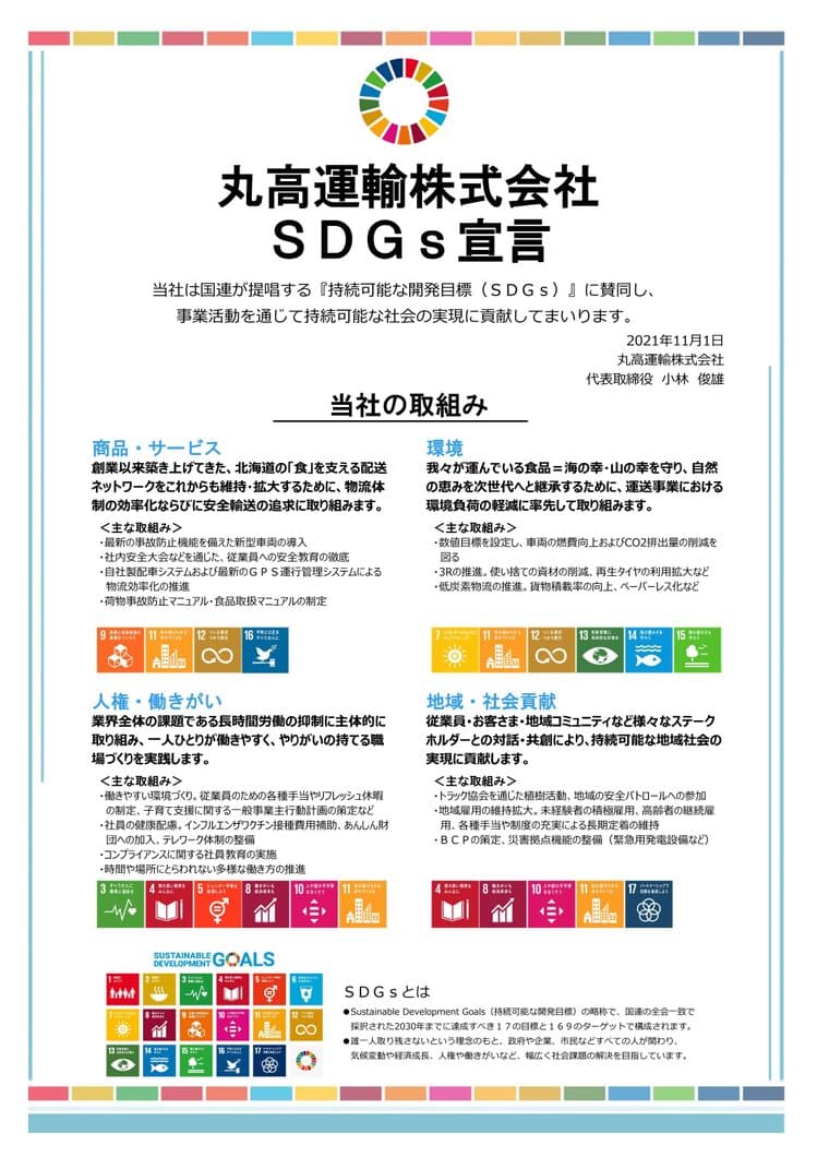 1.北海道を支える大切な食品を預けていただいた皆様の信頼にこたえるため、社員一人一人がプロの意識をもって安全な輸送のために尽力します。 2.SDGsの考えに賛同し、運送事業における環境負荷の軽減や、持続可能な地域社会の実現に向けて積極的に取り組みます。 3.業界全体の課題である長時間労働の抑制に積極的に取り組み、一人一人が働きやすく、やりがいの持てる職場づくりを実践します。